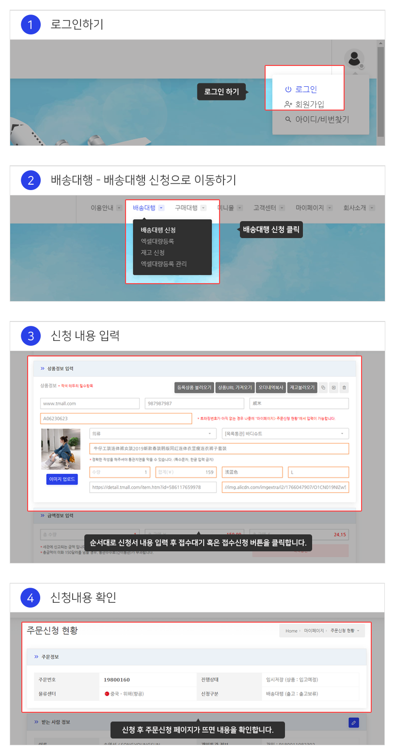 2) 쇼핑몰에서 한번에 결제한 상품은 모두 한 배송대행 신청서에 입력하여 신청하셔야 합니다. * 상품이 1개라도 물류센터에 도착하면 신청서 수정이 불가능합니다.